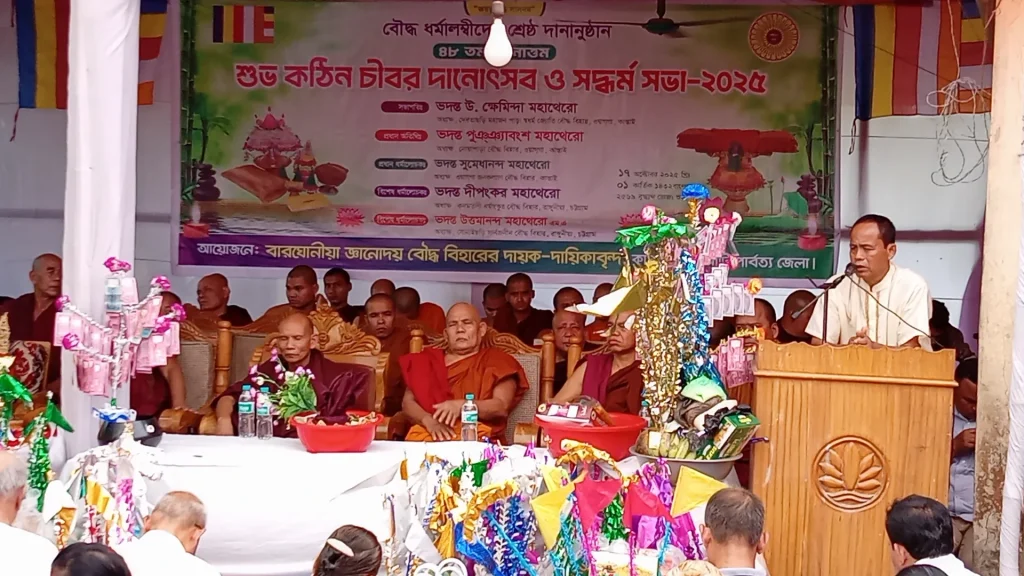 পৃথিবীর সকল প্রকার দানীয় সামগ্রী একত্র করিয়া দান করিলেও একখানা কঠিন চীবর দানের ষোল ভাগের এক ভাগ হয় না”— তথাগত বুদ্ধের এই মহান উক্তিকে ধারণ করে কাপ্তাই উপজেলার বারঘোনীয়া জ্ঞানোদয় বৌদ্ধ বিহারে শুক্রবার (১৭ অক্টোবর ২০২৫ ইং) শুভ ৪৮তম কঠিন চীবর দানোত্তম উৎসব ও সদ্ধর্ম সভা অনুষ্ঠিত হয়। বুদ্ধ শাসনের চিরস্থিতি কামনায় আয়োজিত এই পুণ্যময় অনুষ্ঠানে সকল ধর্মপ্রাণ ভিক্ষু, উপাসক-উপাসিকা, দায়ক-দায়িকা ও ভক্তবৃন্দ স্ব-বান্ধব অংশগ্রহণ করেন।