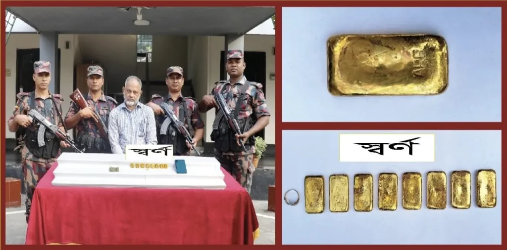 যশোর শহরতলীর মুড়লী মোড় এলাকা থেকে ১ কেজি ২০ গ্রাম ওজনের আটটি স্বর্ণের বার ও একটি স্বর্ণের আংটিসহ এক পাচারকারীকে আটক করেছে বর্ডার গার্ড বাংলাদেশ (বিজিবি) সদস্যরা। আটককৃতের নাম শেখ অলিউল্লা (৫৫)। তিনি সাতক্ষীরা সদর উপজেলার মধ্যকাটিয়া গ্রামের শেখ আরিজুল্লাহর ছেলে। আজ রোববার (২৬ অক্টোবর) সকাল সাড়ে ৬টার দিকে গোপন সংবাদের ভিত্তিতে যশোর ব্যাটালিয়ন (৪৯ বিজিবি)এর একটি বিশেষ দল এই অভিযান চালায়। এসময় যশোর-খুলনা মহাসড়কের মুড়লী মোড় এলাকায় তল্লাশির সময় অলিউল্লার কোমরে বিশেষ কায়দায় লুকানো অবস্থায় আটটি স্বর্ণের বার ও একটি আংটি পাওয়া যায়। এছাড়া তার কাছ থেকে একটি মোবাইল ফোন ও নগদ ১ হাজার ৭৬০ টাকা জব্দ করা হয়েছে। বিজিবির পক্ষ থেকে জানানো হয়,আটক অলিউল্লা প্রাথমিক জিজ্ঞাসাবাদে স্বীকার করেছেন যে,তিনি ঢাকার যাত্রাবাড়ী এলাকার চোরাকারবারীদের কাছ থেকে স্বর্ণগুলো সংগ্রহ করে যশোর হয়ে ভারতে পাচারের উদ্দেশ্যে যাচ্ছিলেন। জব্দকৃত স্বর্ণের আনুমানিক বাজারমূল্য এক কোটি ৮৩ লাখ ২ হাজার ৩৪১ টাকা। মোবাইল ও নগদ অর্থসহ মোট সিজারমূল্য দাঁড়ায় এক কোটি ৮৩ লাখ ২৪ হাজার ১০১ টাকা।