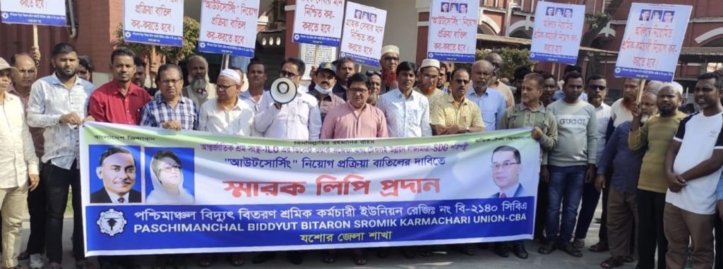 আউটসোর্সিং ভিত্তিক নিয়োগ প্রক্রিয়া বাতিলের দাবিতে বাংলাদেশ জাতীয়তাবাদী শ্রমিক দলের অন্তর্ভুক্ত পশ্চিমাঞ্চল বিদ্যুৎ বিতরণ শ্রমিক–কর্মচারী ইউনিয়ন যশোর জেলা প্রশাসকের কাছে স্মারকলিপি প্রদান করেছে। আজ রোববার সকাল সাড়ে দশটার দিকে কেন্দ্রীয় কর্মসূচির অংশ হিসেবে এ স্মারকলিপি প্রদান করা হয়। কর্মসূচিতে নেতৃত্ব দেন জাতীয়তাবাদী শ্রমিক দল যশোর জেলা শাখার ভারপ্রাপ্ত সভাপতি মো. আবু জাফর। তিনি বলেন, বিদ্যুৎ বিভাগের আউটসোর্সিং পদ্ধতিতে নিয়োগ শ্রমিকদের স্থায়ী নিয়োগ, ন্যায্য অধিকার ও নিরাপত্তা ক্ষুণ্ন করে। তাই এ প্রক্রিয়া বাতিল করে যোগ্যতার ভিত্তিতে স্বচ্ছ নিয়োগ নিশ্চিত করার দাবিতে কেন্দ্রীয়ভাবে এই কর্মসূচি পালন করা হচ্ছে।