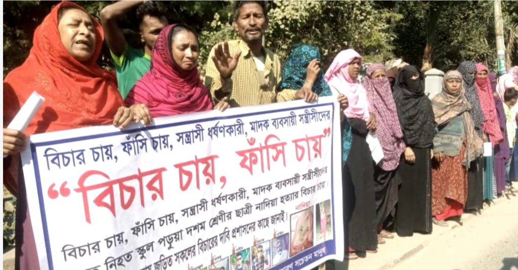 যশোরে ইছালি সরকারি মাধ্যমিক বিদ্যালয়ের দশম শ্রেণির ছাত্রী নাদিয়া আক্তার নদীর হত্যার বিচার চেয়ে রাজপথে নেমেছে স্বজনও স্থানীয়রা।পরিবার ও এলাকাবাসীর জোরালো দাবি, এটি কোনো আত্মহত্যা নয়, বরং প্রেমিক নাজমুল কর্তৃক সংঘটিত একটি পরিকল্পিত হত্যাকাণ্ড। এই নির্মম হত্যাকাণ্ডের মূল অভিযুক্ত প্রেমিক নাজমুল-এর অবিলম্বে গ্রেপ্তার ও ফাঁসির দাবি নিয়ে রোববার ১৪ ডিসেম্বর বেলা সাড়ে ১১টায় প্রেসক্লাব যশোরের সামনে এক মিছিল ও মানববন্ধন করেছে পরিবার ও স্থানীয়রা। মানববন্ধনে অংশগ্রহণকারী নাদিয়া আক্তার-এর স্বজন ও স্থানীয় বাসিন্দারা অভিযোগ করেন,নিহত নাদিয়া-র সাথে একই গ্রামের যুবক নাজমুল-এর প্রায় তিন বছরের প্রেমের সম্পর্ক ছিল। এই সম্পর্কের গভীরতা বাড়লে তাদের মধ্যে শারীরিক সম্পর্কও তৈরি হয়। নাজমুল সেই শারীরিক সম্পর্কের মুহূর্তের ভিডিও ধারণ করেন এবং তা ব্যবহার করে নাদিয়াকে লাগাতার ব্ল্যাকমেইল করে আসছিলেন। এক পর্যায়ে তা সামাজিক যোগাযোগ মাধ্যমেও ছড়িয়ে দেয়। এই মানসিক চাপের মুখে নাদিয়া গত ১১ ডিসেম্বর রাত আটটার দিকে নাজমুল-এর বাড়িতে যান এবং তাকে বিয়ের দাবি জানান। স্বজনদের দাবি, বিয়ের দাবি প্রত্যাখ্যান করে নাজমুলসহ তার পরিবারের সদস্যরা নাদিয়া আক্তার নদীকে মারপিট করে। এরপর তারা নাদিয়ার মরদেহ উঠানে ঝুলিয়ে রেখে আত্মহত্যার নাটক সাজানো হয়। পরবর্তীতে নাদিয়া-র পরিবারকে খবর দেওয়া হয়। তারা নাজমুলসহ এ ঘটনার সাথে জড়িত ফাইজুর, কামাল, হোসেন, মিজারুল, বাবলু, নাইম, রিয়াজ ও নাসির-এর আটক ও ফাঁসির দাবি জানান। মানববন্ধনে নাদিয়ার স্বজন শিল্পি বেগম, সকিনা আক্তার, জলি খাতুন সহ স্থানীয় বহু মানুষ অংশ নেন। তারা অবিলম্বে এই ঘটনার সুষ্ঠু তদন্ত ও দ্রুত বিচারের মাধ্যমে প্রধান অভিযুক্ত প্রেমিক নাজমুলের ফাঁসির দণ্ড কার্যকর করার দাবি জানান। তাদের মতে, এটি একটি সুপরিকল্পিত হত্যাকাণ্ড,কোনোভাবেই আত্মহত্যা নয়।