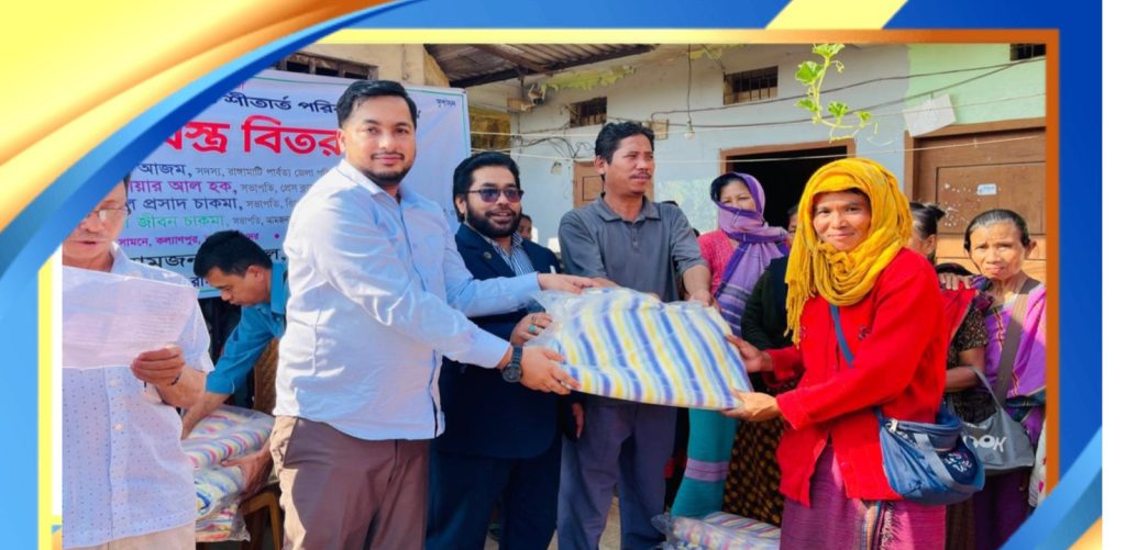 রাঙামাটিতে পাহাড়ি ও বাঙালি জনগোষ্ঠীর মিলিত উদ্যোগ সম্প্রীতি ও সামাজিক বন্ধন দৃঢ় রাখার একটি অনন্য উদাহরণ হয়ে উঠেছে। শনিবার (১৭ জানুয়ারি) কল্যাণপুরে শতাধিক দুঃস্থ, অসহায় ও গরিব মানুষের মাঝে শীতবস্ত্র বিতরণ করা হয়। অনুষ্ঠানটি শুধুমাত্র শীতার্তদের তাপ দান করেনি, বরং পার্বত্য অঞ্চলের সকল জনগোষ্ঠীর মধ্যে ভ্রাতৃত্ব ও সহমর্মিতা আরও শক্তিশালী করেছে।প্রধান অতিথি রাঙামাটি পার্বত্য জেলা পরিষদের সদস্য মো. হাবীব আজম বলেন, শীত মৌসুমে গরিব ও অসহায় মানুষের পাশে দাঁড়ানো শুধু মানবিক দায়িত্ব নয়, এটি পার্বত্য অঞ্চলের জনগোষ্ঠীর মধ্যে সম্প্রীতি ও সামাজিক বন্ধন দৃঢ় রাখারও একটি গুরুত্বপূর্ণ উদ্যোগ। পাহাড়ি ও বাঙালি সকল জনগোষ্ঠীকে নিয়ে সম্প্রীতির রাঙামাটি গড়ে তোলা আমাদের লক্ষ্য। সম্প্রীতি ছাড়া কোনো জাতি উন্নতি করতে পারে না। তিনি আরও বলেন, যখন মানুষ একে অপরের পাশে থাকে, তারা ব্যক্তিগত ও সামাজিক জীবনে আরো সক্রিয় ও কর্মক্ষম থাকে, এবং এতে স্থানীয় অর্থনীতি ও ব্যবসাও সচল থাকে। বিশেষ অতিথি রাঙামাটি প্রেস ক্লাবের সভাপতি আনোয়ার আল হক যোগ করেন, মানবিক উদ্যোগ এবং পার্বত্য অঞ্চলের জনগোষ্ঠীর মিলিত প্রচেষ্টা স্থানীয় ব্যবসা, কৃষি ও উৎপাদনশীলতাকে সহায়তা করে। এতে সমাজে বিশ্বাস ও বন্ধন দৃঢ় হয়। সভাপতি সুশীল জীবন চাকমা বলেন, এই ধরনের উদ্যোগ শুধু মানুষের জীবনযাত্রা উন্নত করে না, বরং পার্বত্য অঞ্চলের সামাজিক বন্ধন ও সম্প্রীতিও আরও দৃঢ় করে। অনুষ্ঠানে উপস্থিত শতাধিক শীতার্ত পরিবার শীতবস্ত্র পেয়ে কৃতজ্ঞতা প্রকাশ করেন। আয়োজকরা জানান, এই ধরনের মানবিক উদ্যোগ মানুষকে কর্মক্ষম রাখে, সামাজিক বন্ধন বজায় রাখে এবং পার্বত্য অঞ্চলের অর্থনৈতিক ও সামাজিক স্থিতিশীলতাকে সহায়তা করে।