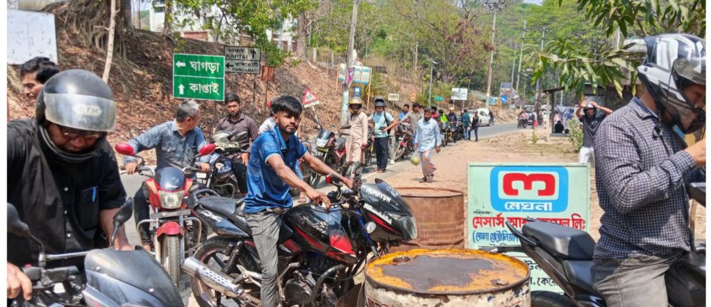 রাঙামাটির কাপ্তাই উপজেলার বরইছড়ি সদর এলাকায় জ্বালানি তেলের তীব্র সংকট দেখা দিয়েছে। তেলের সরবরাহ বিপর্যয়ের কারণে বুধবার (২৫ মার্চ) সকাল থেকেই স্থানীয় ফিলিং স্টেশনগুলোতে মোটরসাইকেল চালকদের কিলোমিটারব্যাপী দীর্ঘ লাইনে দাঁড়িয়ে অপেক্ষা করতে দেখা যায়। ঘণ্টার পর ঘণ্টা অপেক্ষা করে চরম ভোগান্তিতে পড়েছেন সাধারণ যাত্রী, পর্যটক এবং পেশাজীবী চালকরা। সরেজমিনে দেখা যায়, সরকারের নির্ধারিত দামে বরইছড়ি সদরে অবস্থিত ‘আশা অয়েল লিমিটেড’-এ সকাল থেকেই মোটরসাইকেলের উপচে পড়া ভিড়। বেলা বাড়ার সঙ্গে সঙ্গে লাইনের দৈর্ঘ্য বাড়তে বাড়তে প্রধান সড়কের একাংশ পর্যন্ত বিস্তৃত হয়। কাপ্তাই একটি অন্যতম পর্যটন এলাকা হওয়ায় বিভিন্ন জেলা ও উপজেলা থেকে আগত পর্যটকরাও তেলের অভাবে মাঝপথে আটকে পড়ে চরম বিপাকে পড়েছেন। সবচেয়ে বেশি ক্ষতিগ্রস্ত হচ্ছেন দুর্গম এলাকায় ভাড়ায় মোটরসাইকেল চালিয়ে জীবিকা নির্বাহ করা চালকরা। দুর্গম পাহাড়ি এলাকায় যাতায়াতের প্রধান মাধ্যম মোটরসাইকেল হওয়ায় সাধারণ মানুষের চলাচল অনেকটাই স্থবির হয়ে পড়েছে। একজন ভুক্তভোগী চালক ক্ষোভ প্রকাশ করে বলেন, আমরা দিন আনি দিন খাই। তেলের জন্য সকাল থেকে বসে আছি, কাজ নেই। জরুরি কাজে যারা যেতে চান, তাদেরও নিতে পারছি না। তেল পাব কি না, তাও জানি না। স্টেশনে অতিরিক্ত ভিড় ও সম্ভাব্য বিশৃঙ্খলা এড়াতে কাপ্তাই থানা পুলিশের একটি টিম শুরু থেকেই তৎপর রয়েছে। সারিবদ্ধভাবে যানবাহন দাঁড় করানো এবং লাইনে শৃঙ্খলা বজায় রাখতে পুলিশ সদস্যরা সক্রিয় ভূমিকা পালন করছেন। অপ্রীতিকর ঘটনা এড়াতে পুলিশের এই তদারকিকে সাধুবাদ জানিয়েছেন স্থানীয়রা। স্থানীয় সচেতন মহলের মতে, কাপ্তাইয়ের বিভিন্ন এলাকা থেকে বিপুল সংখ্যক মানুষ একটি মাত্র স্টেশনে ভিড় করায় পরিস্থিতি আরও জটিল হয়ে উঠেছে। চাহিদার তুলনায় জোগান কম থাকা এবং সরবরাহ ব্যবস্থার ধীরগতিই এই সংকটের প্রধান কারণ বলে মনে করা হচ্ছে। সংশ্লিষ্ট কর্তৃপক্ষের পক্ষ থেকে এখনো আনুষ্ঠানিক কোনো লিখিত বক্তব্য পাওয়া না গেলেও, মৌখিকভাবে জানানো হয়েছে—সরবরাহ স্বাভাবিক করতে প্রয়োজনীয় পদক্ষেপ গ্রহণ করা হচ্ছে। তবে কবে নাগাদ পরিস্থিতি পুরোপুরি স্বাভাবিক হবে, সে বিষয়ে সুনির্দিষ্ট কোনো সময়সীমা জানানো হয়নি। দ্রুত এই সমস্যার স্থায়ী সমাধান করে কাপ্তাইয়ের জনজীবন ও পর্যটন খাত স্বাভাবিক করার দাবি জানিয়েছেন স্থানীয় বাসিন্দারা।